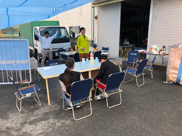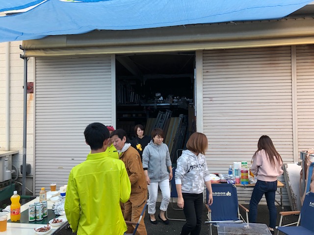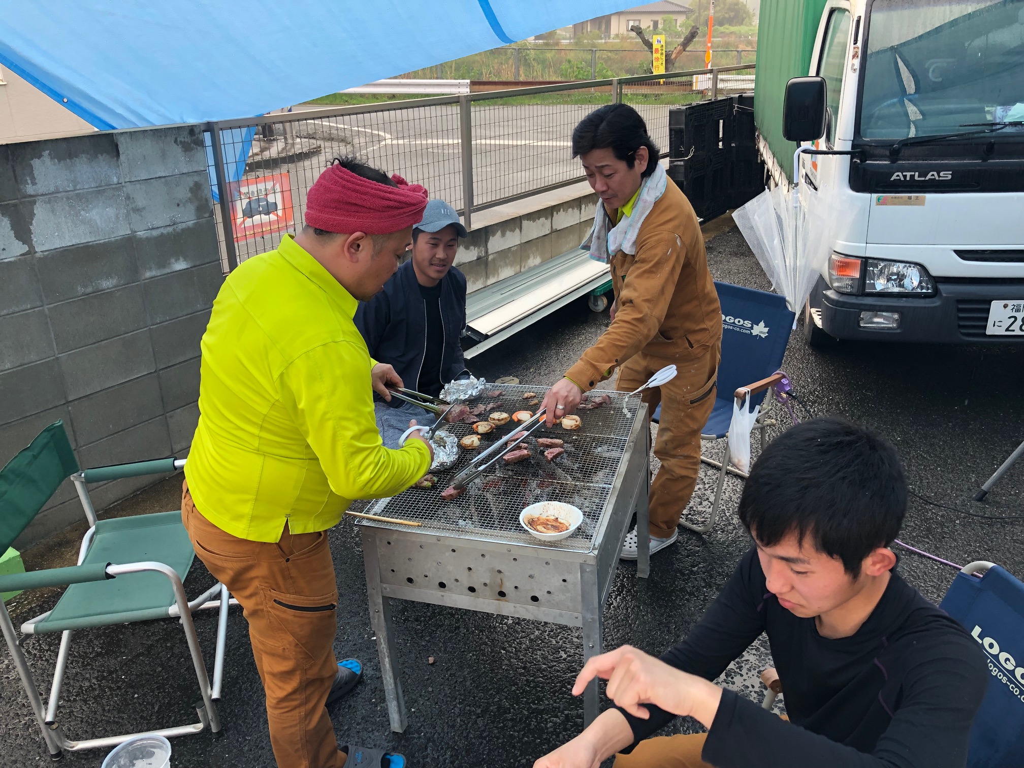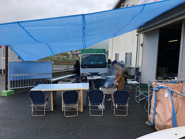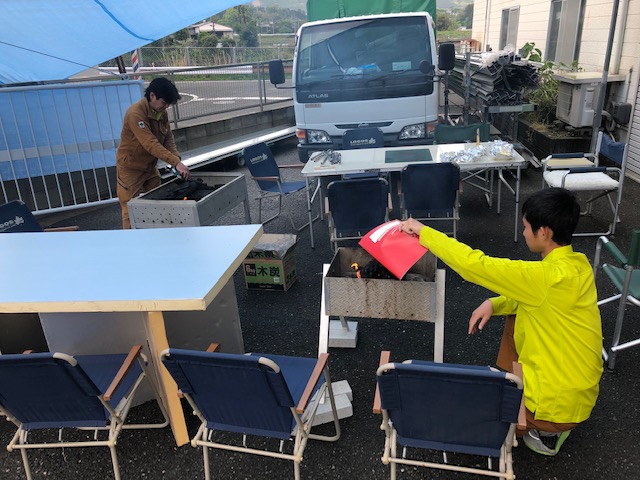 雨男と噂されるH課長のおかげで、すっかり雨に恵まれたので、ブルーシート屋根に護られながらの楽しい準備スタート