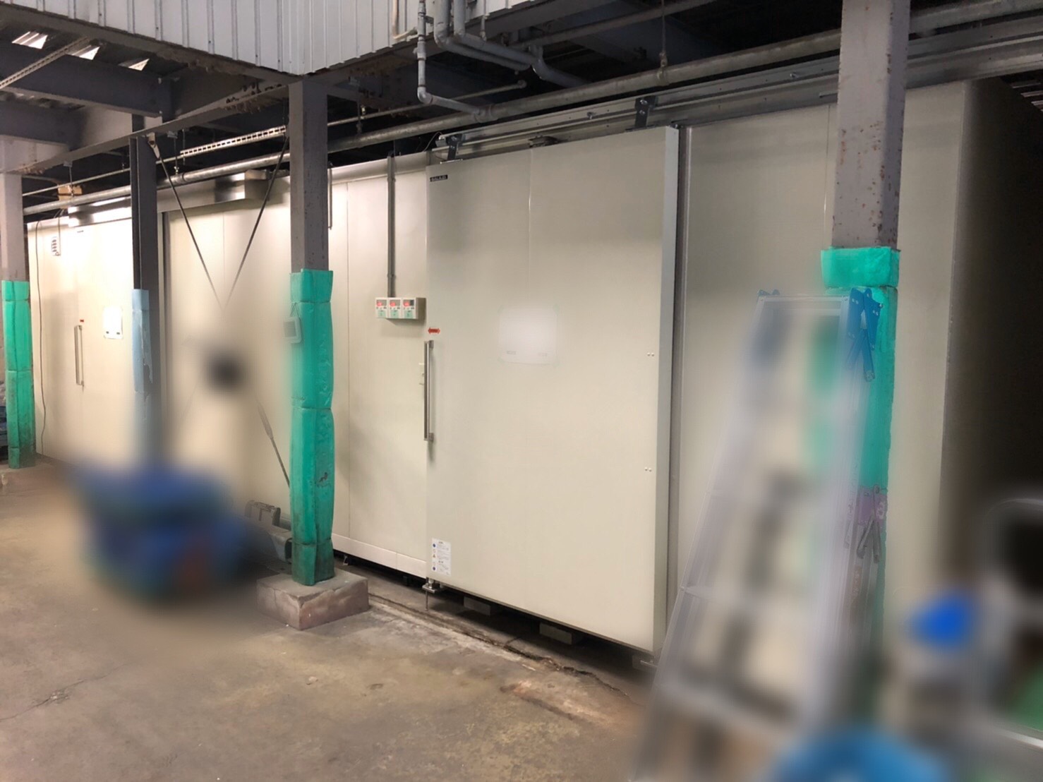 倉庫内に設置されているプレハブ冷凍庫2台、冷蔵庫1台の(旧⇒新)解体からの設置にやってまいりました。