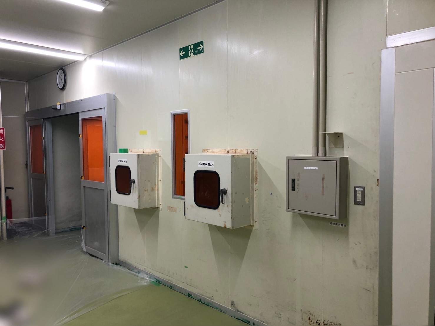 エアーシャワーの入替にともないクリーンルームパネルの仕様変更、パスボックスは後からの入替予定。